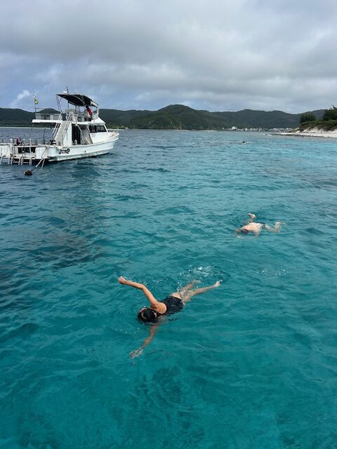 隣のダイビング船はドライスーツ。ザマミセーリングのゲストは水着で泳ぐ不思議な光景。